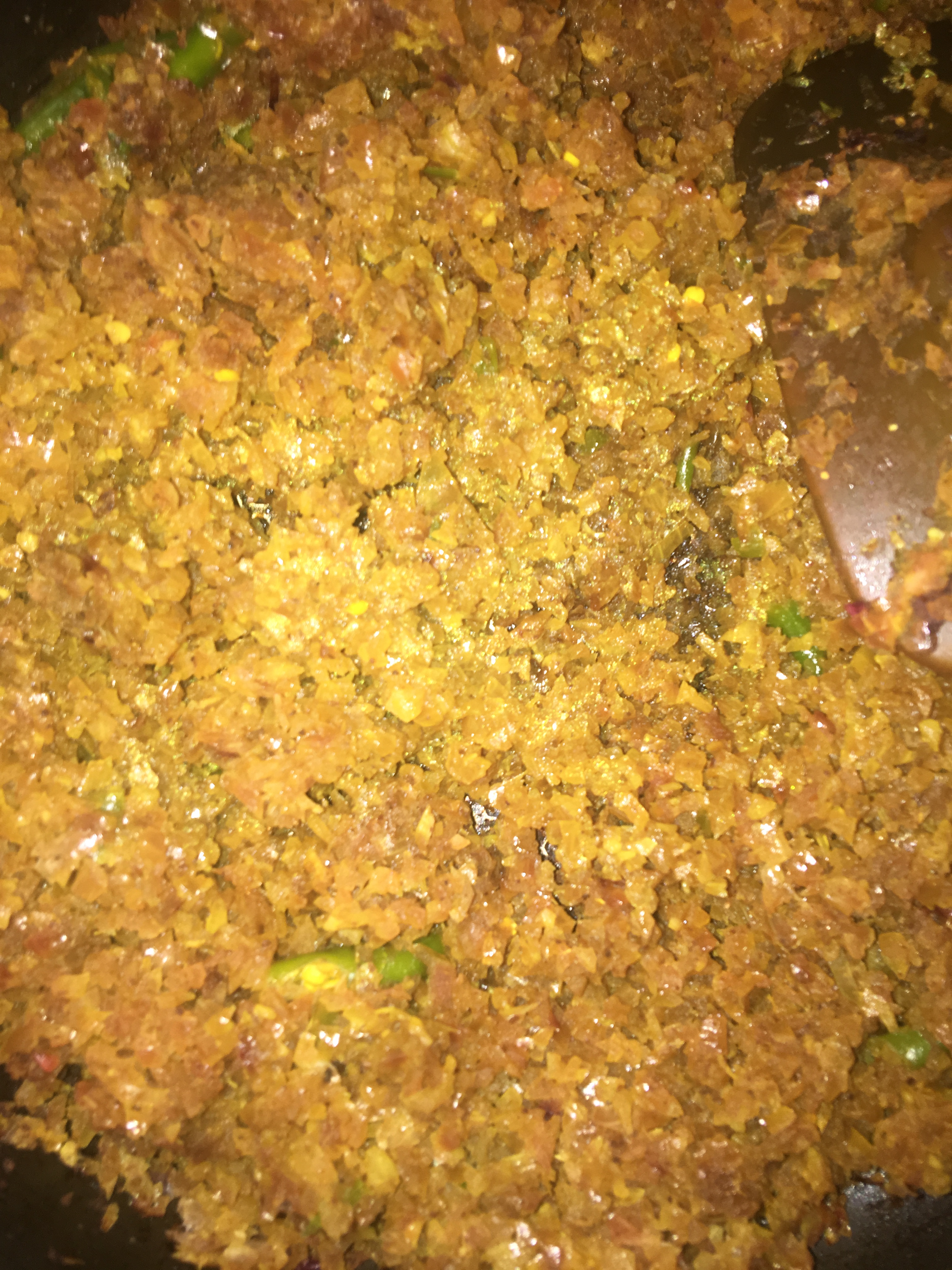 Fine chop or grate the onions. Sauté with turmeric, aamchur / mango powder, salt and green chilly. (I minced the chilly with the onions). Once brown, remove from fire.
