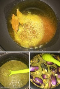 At this stage, you can shallow fry the brinjals first. I prefer to pour the ground paste into the hot oil and then add the raw brinjals. Add salt.